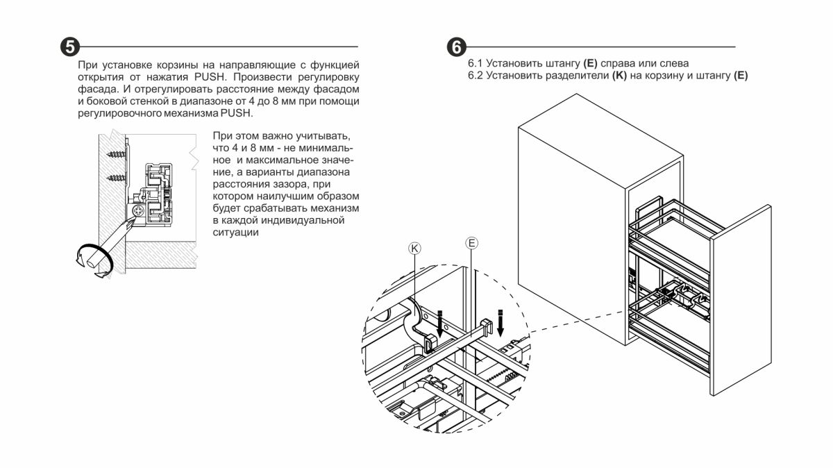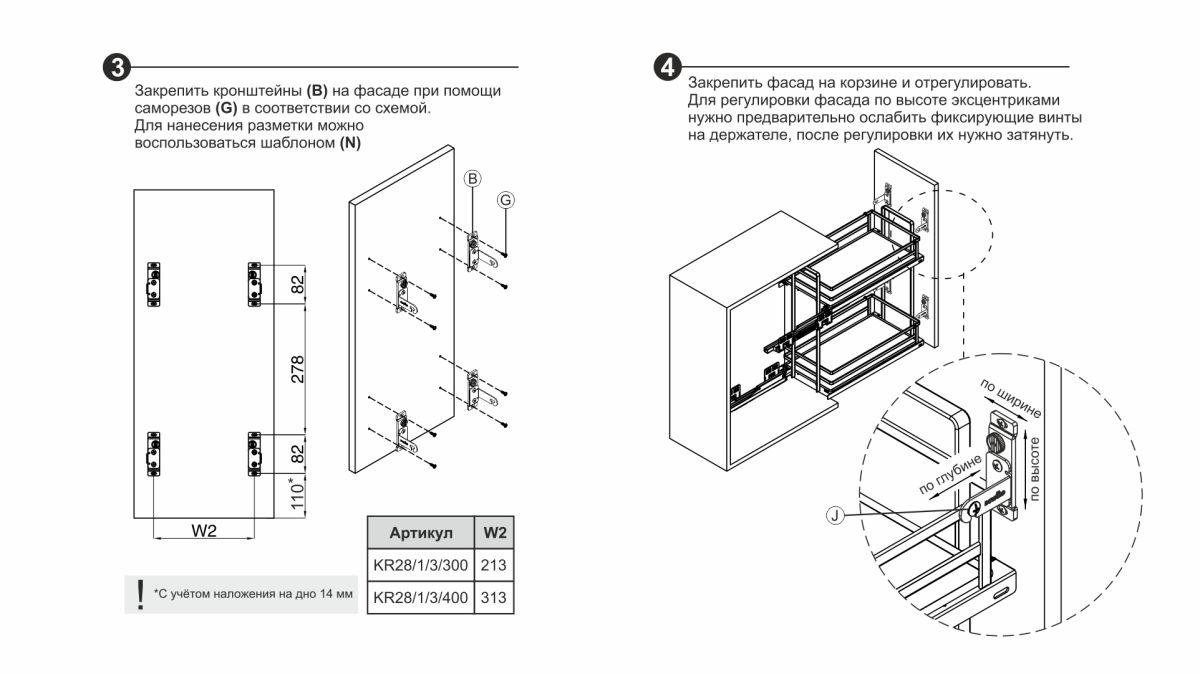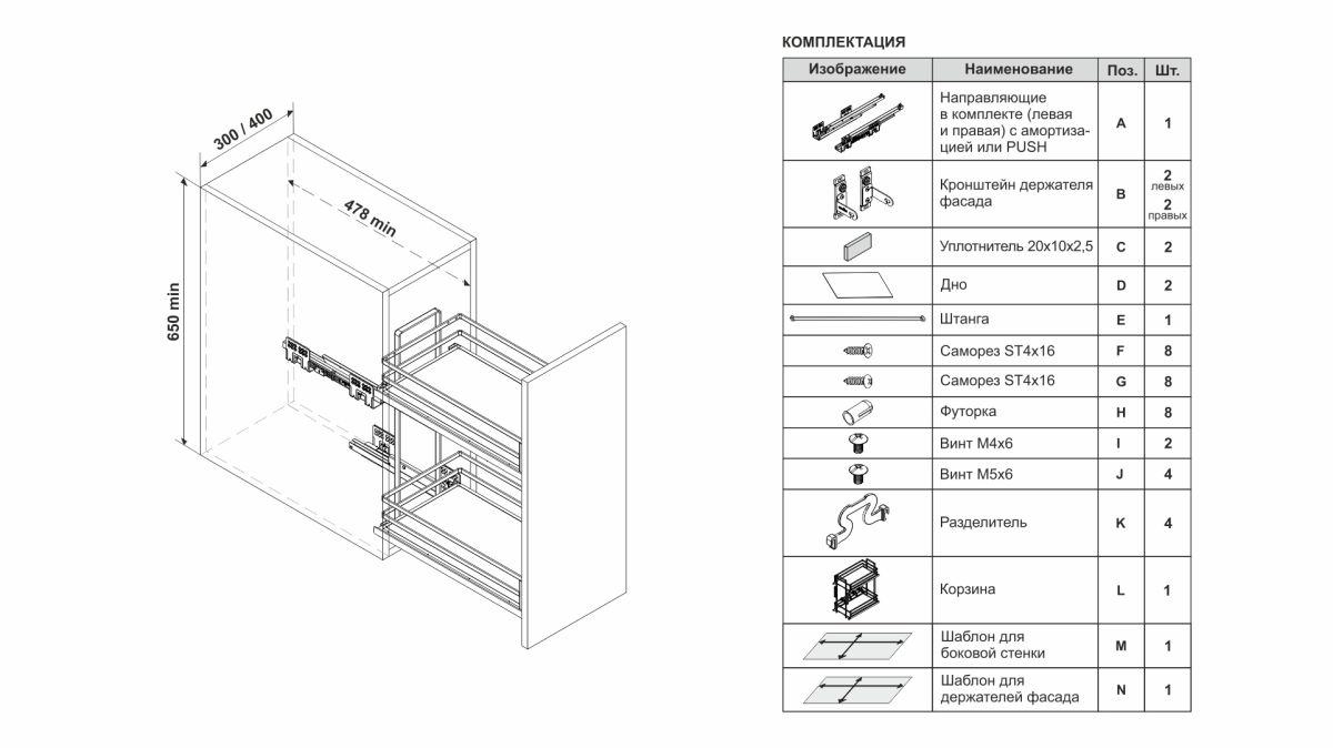 В комплекте с корзиной — съёмные делители для хранения бакалеи, упаковок и ёмкостей весь необходимый крепёж в тон держателям, инструкция и шаблоны присадочных размеров для удобства монтажа.