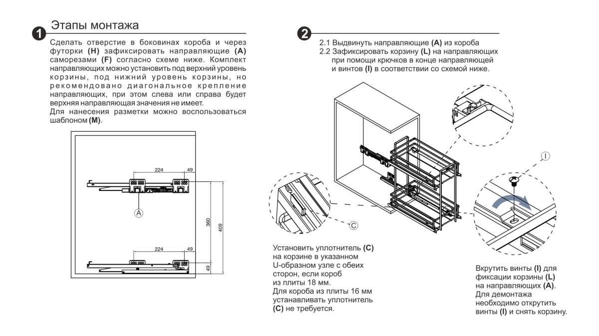 Для наиболее надёжного крепления направляющих и стабильной работы даже максимально нагруженной корзины рекомендуется установка направляющих по диагонали.