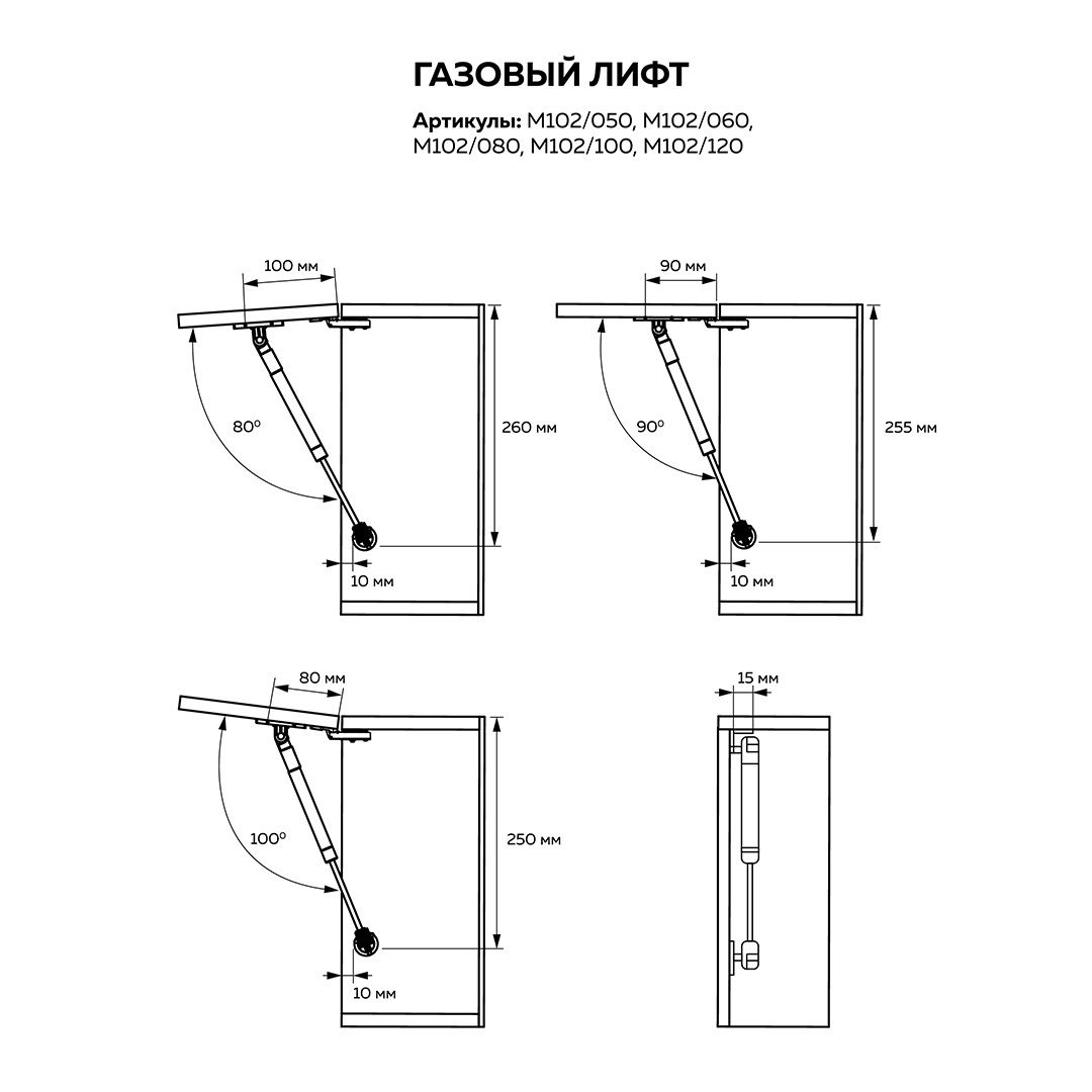 В комплект входит: газовый лифт (1 шт.), 3 крепления (для дерева, металла и ЛДСП), саморезы.