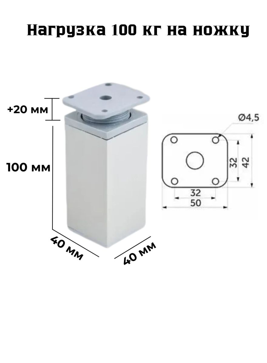 Опоры для мебели – это надежное и стильное решение для вашего интерьера. Способные выдерживать нагрузку до 100 кг, они обеспечивают прочность и устойчивость для различных предметов мебели. Уникальная система регулировки высоты до 20 мм позволяет легко адаптировать ножки под любые условия, что делает их идеальными для неровных поверхностей. Элегантный квадратный дизайн придает мебели современный вид. Не боятся влаги и не ржавеют, поэтому опоры можно устанавливать на кухне или в ванной комнате. Эти ножки – отличный выбор для тех, кто ценит качество, функциональность и стиль!