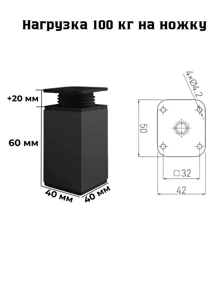 Опоры для мебели – это надежное и стильное решение для вашего интерьера. Способные выдерживать нагрузку до 100 кг, они обеспечивают прочность и устойчивость для различных предметов мебели. Уникальная система регулировки высоты до 20 мм позволяет легко адаптировать ножки под любые условия, что делает их идеальными для неровных поверхностей. Элегантный квадратный дизайн придает мебели современный вид. Не боятся влаги и не ржавеют, поэтому опоры можно устанавливать на кухне или в ванной комнате. Эти ножки – отличный выбор для тех, кто ценит качество, функциональность и стиль!