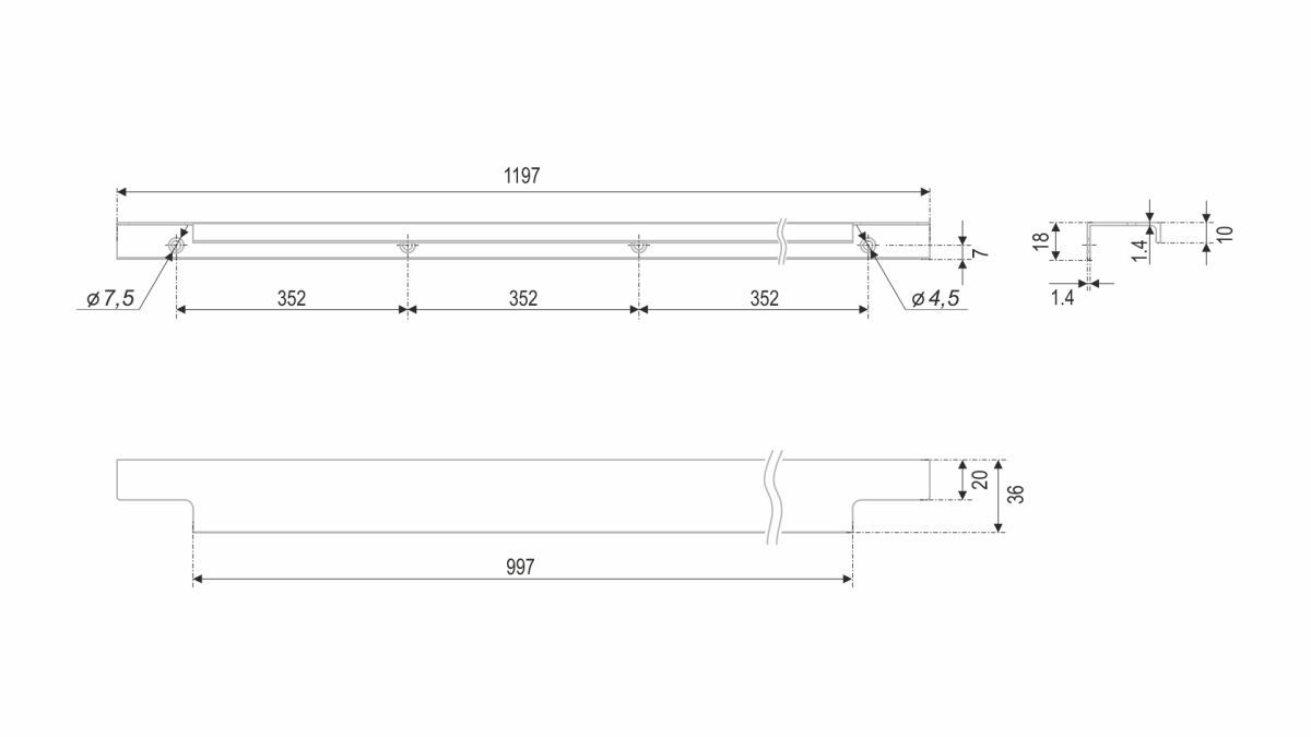 Ручка имеет богатую палитру цветовых решений и разнообразие длин. В зависимости от длины, модель допускает размещение двумя способами — «в размер» фасада и по центру широких фасадов (как большой «язычок»).