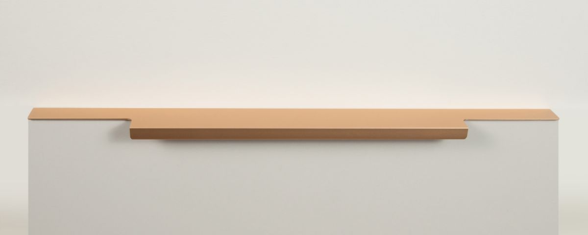 Ручка имеет богатую палитру цветовых решений и разнообразие длин. В зависимости от длины, модель допускает размещение двумя способами — «в размер» фасада и по центру широких фасадов (как большой «язычок»).