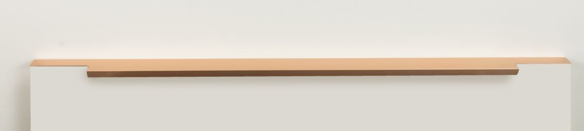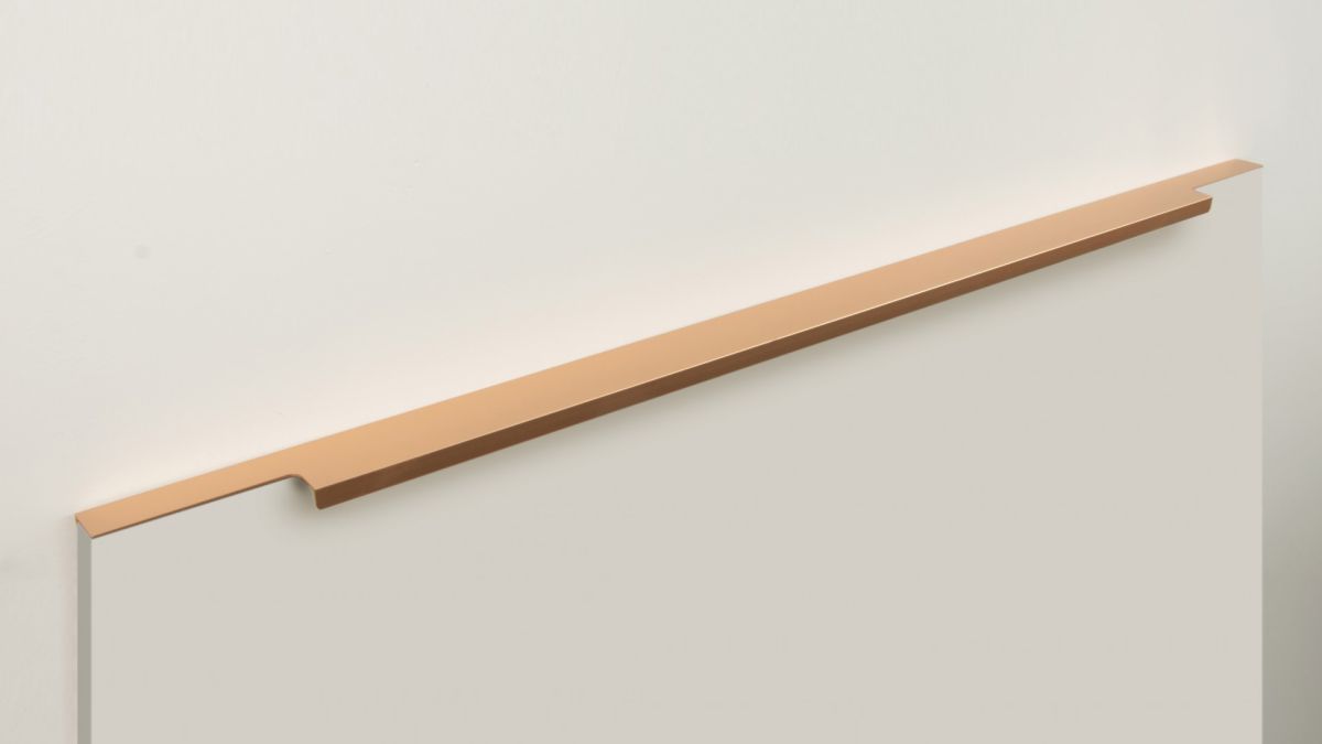 Ручка имеет богатую палитру цветовых решений и разнообразие длин. В зависимости от длины, модель допускает размещение двумя способами — «в размер» фасада и по центру широких фасадов (как большой «язычок»).